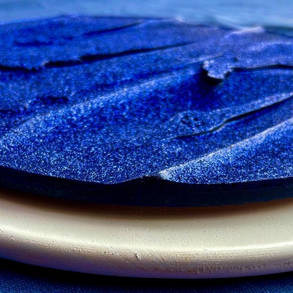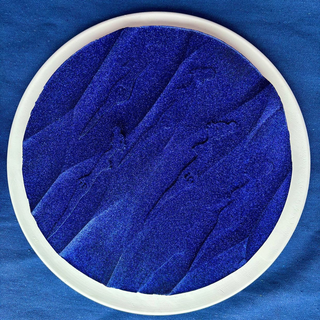 Photographs, acrylic, archived newspaper clippings, archival ink, high gloss varnish, unstretched canvas, shards of broken mirrored blue glass